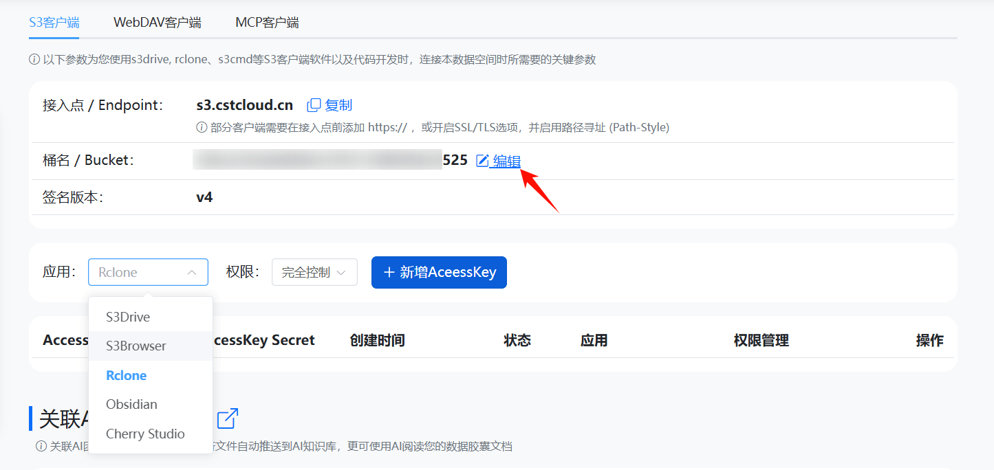 集的 AccessKey ID 及 AccessKey Secret,并可获取到 Endpoint、Bucket、签名版本等参数信息,这些信息在后续 rclone 进行连接时会使用到。创建及获取参数界面如下: