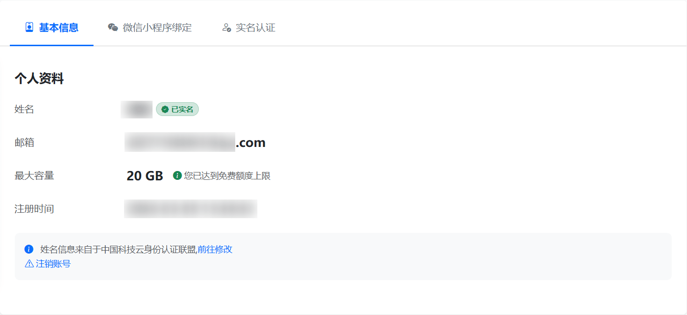 注册之后只有 1GB 空间,需要使用国家网络身份认证 APP 进行实名验证,在这里必须下载这个 APP,已经通过身份证绑定,注册网号。