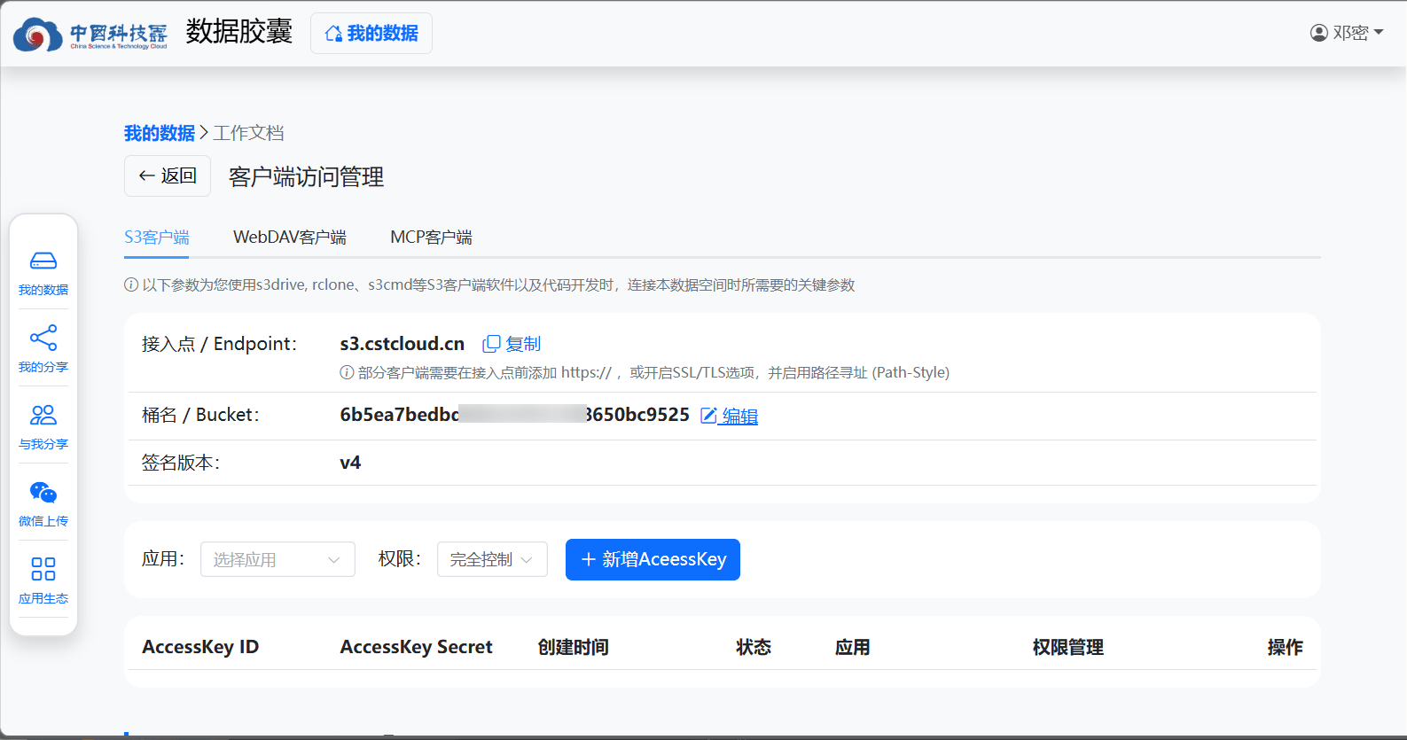 登录中国科技云数据胶囊,进入我的数据,选择要挂载为本地盘的数据集,点击客户端访问管理按钮。如下图: